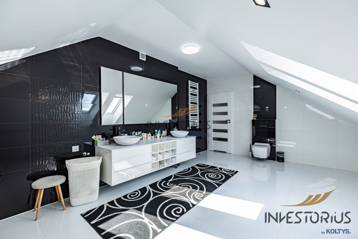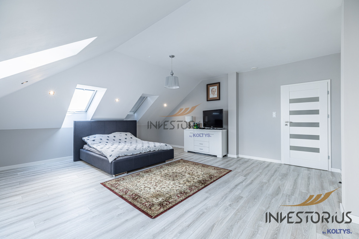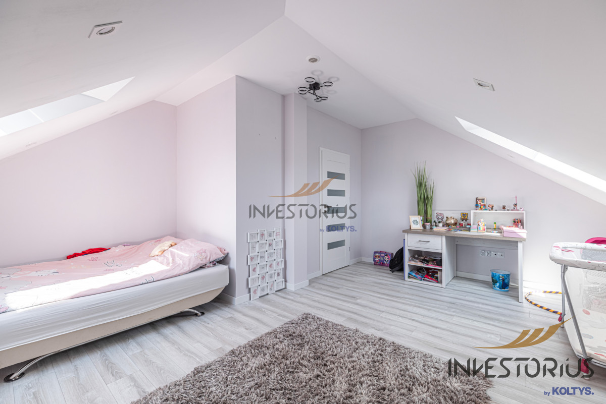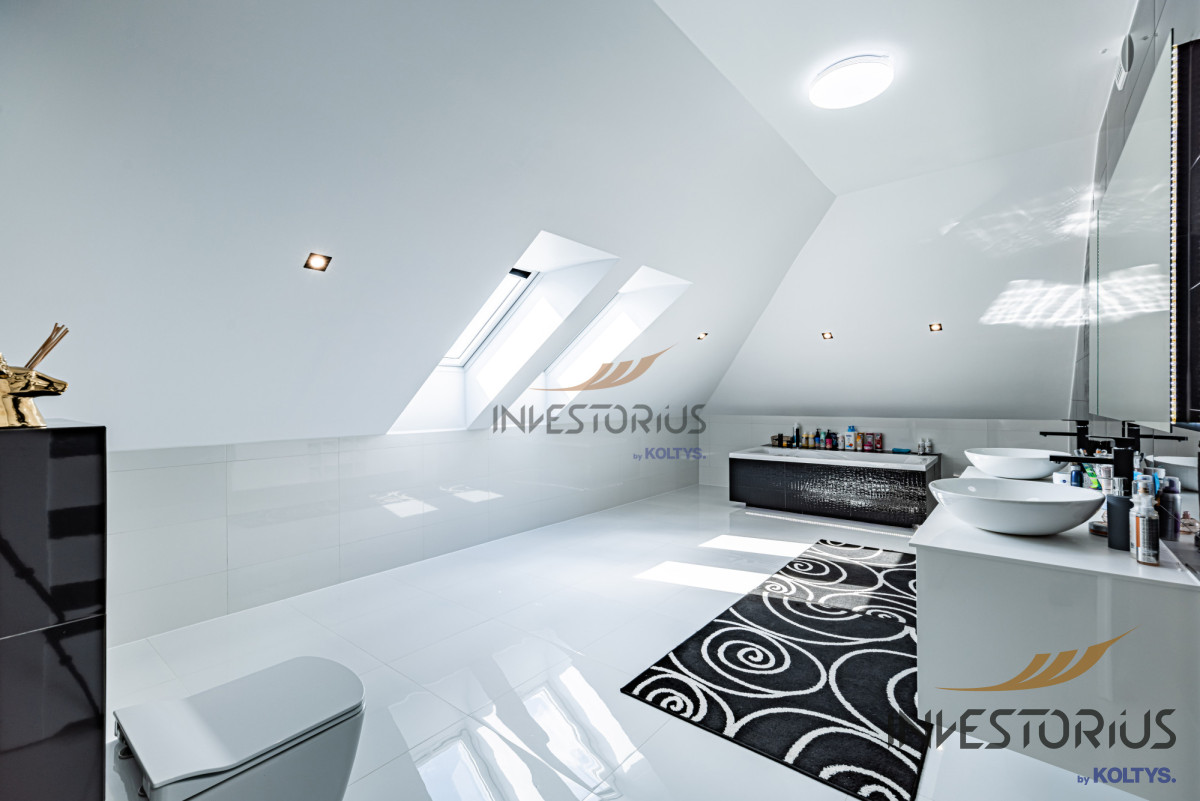 Na poddaszu znajduje się kolejny przedpokój (7,3 m2) oraz trzy sypialnie (17,3 m2, 9 m2, 14,4 m2), łazienka (7,6 m2) oraz garderoba (4 m2).