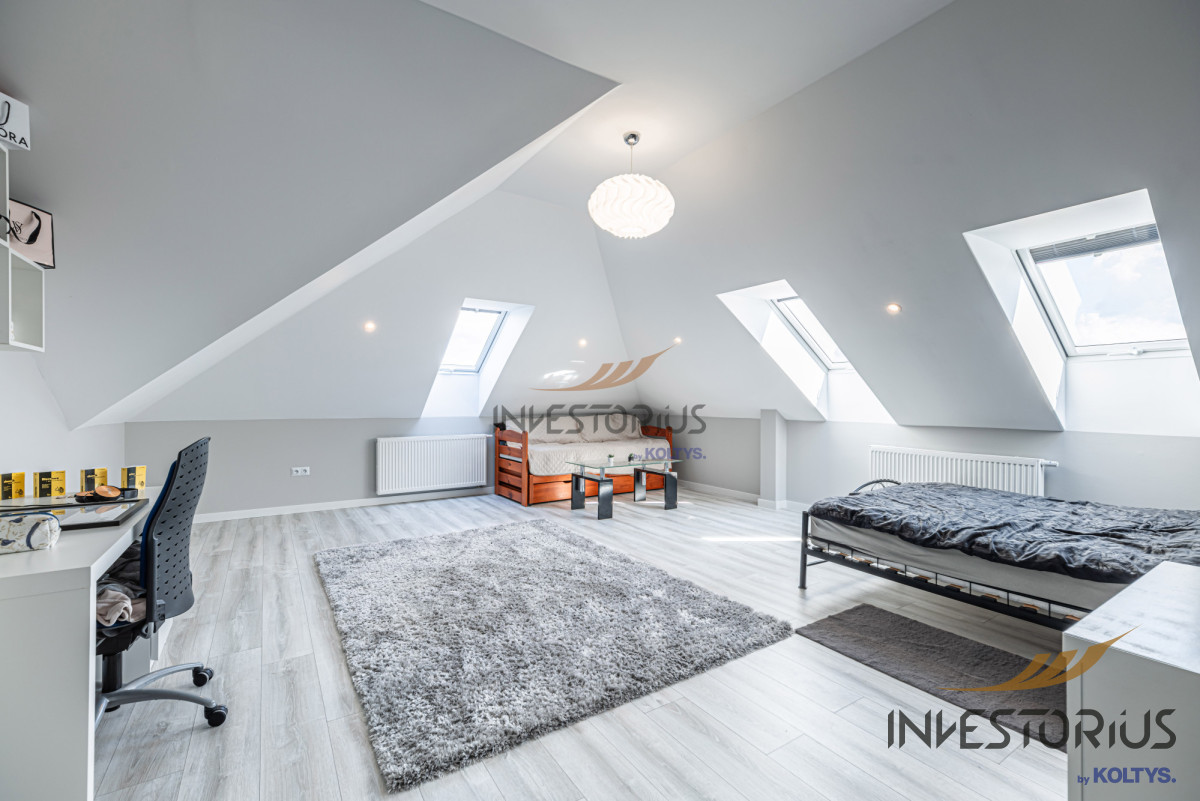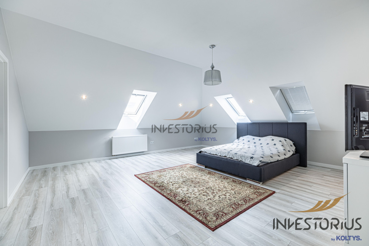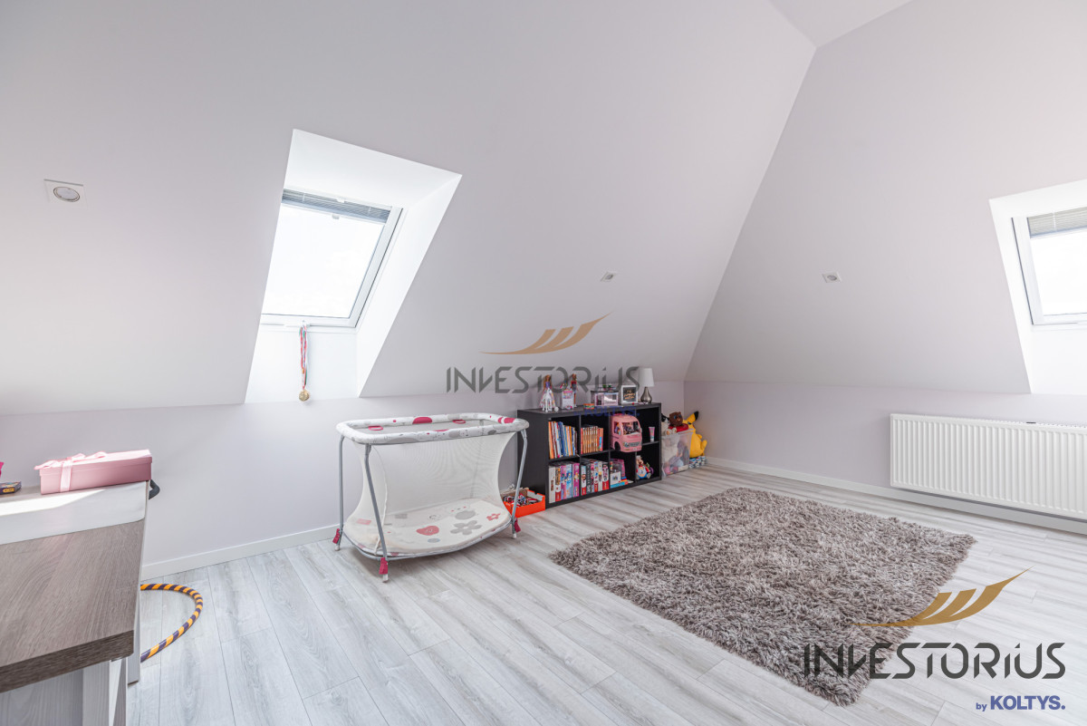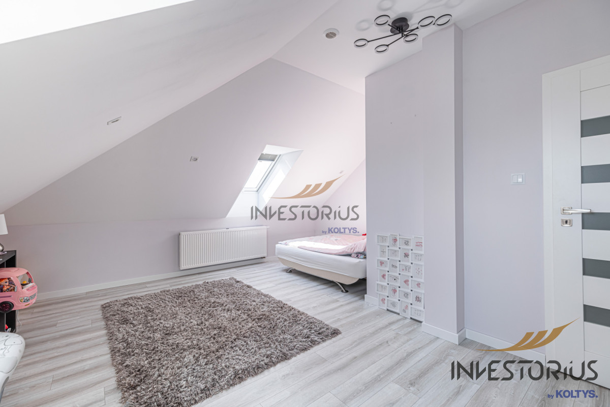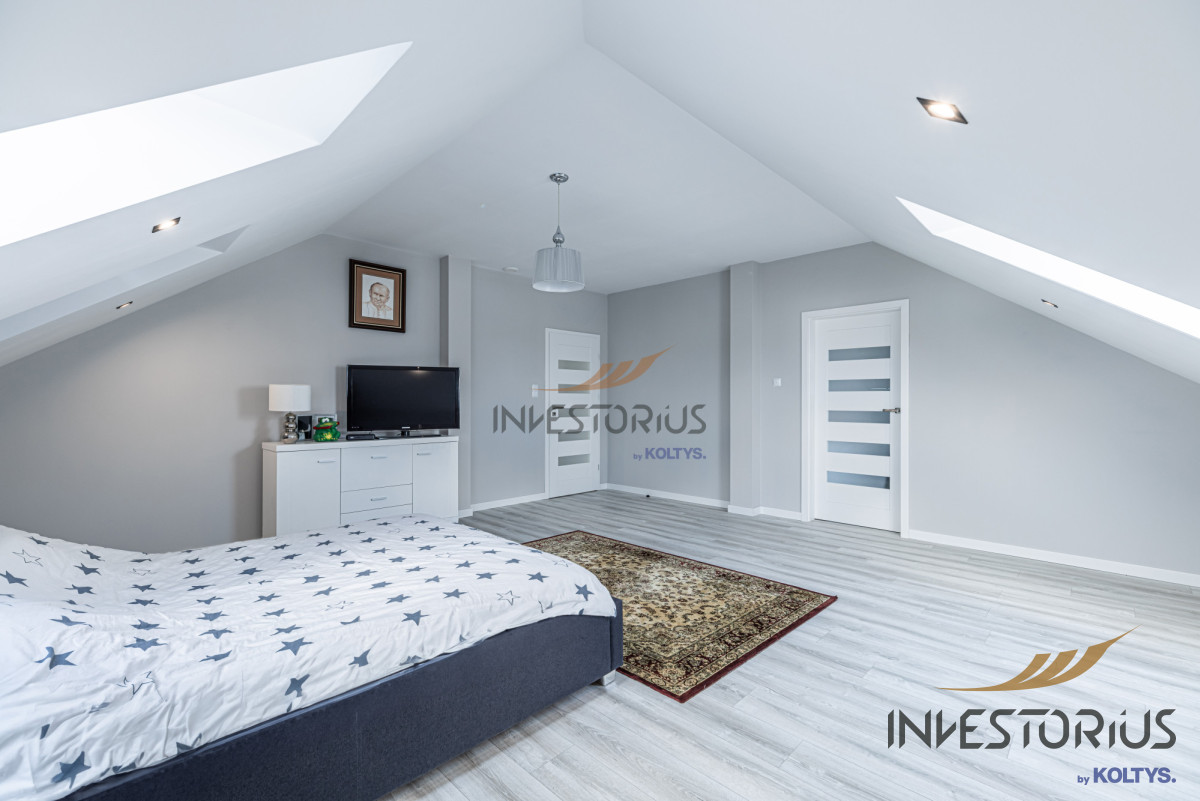Na poddaszu znajduje się kolejny przedpokój (7,3 m2) oraz trzy sypialnie (17,3 m2, 9 m2, 14,4 m2), łazienka (7,6 m2) oraz garderoba (4 m2).