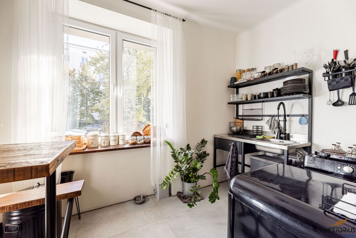 Mieszkanie znajduje się na wysokim parterze i cechuje się wysokością pomieszczeń na poziomie 290 cm, co dodaje wnętrzu specjalnego charakteru.