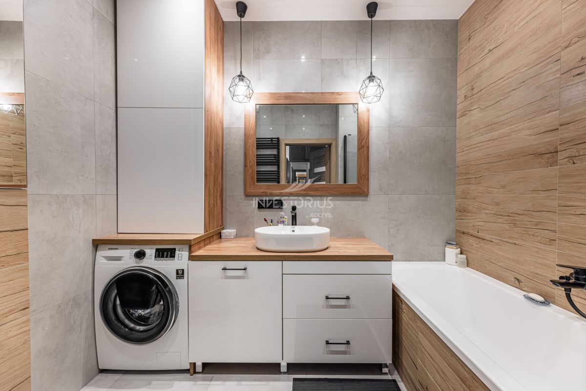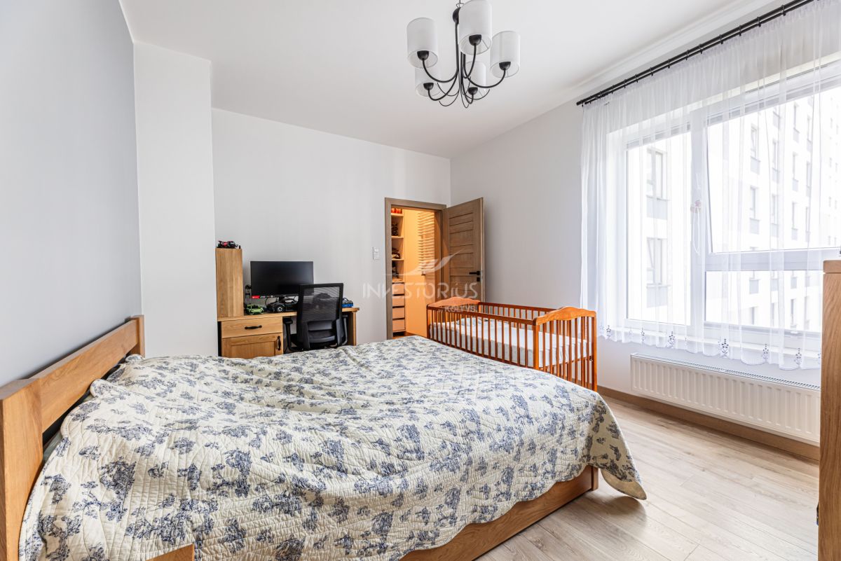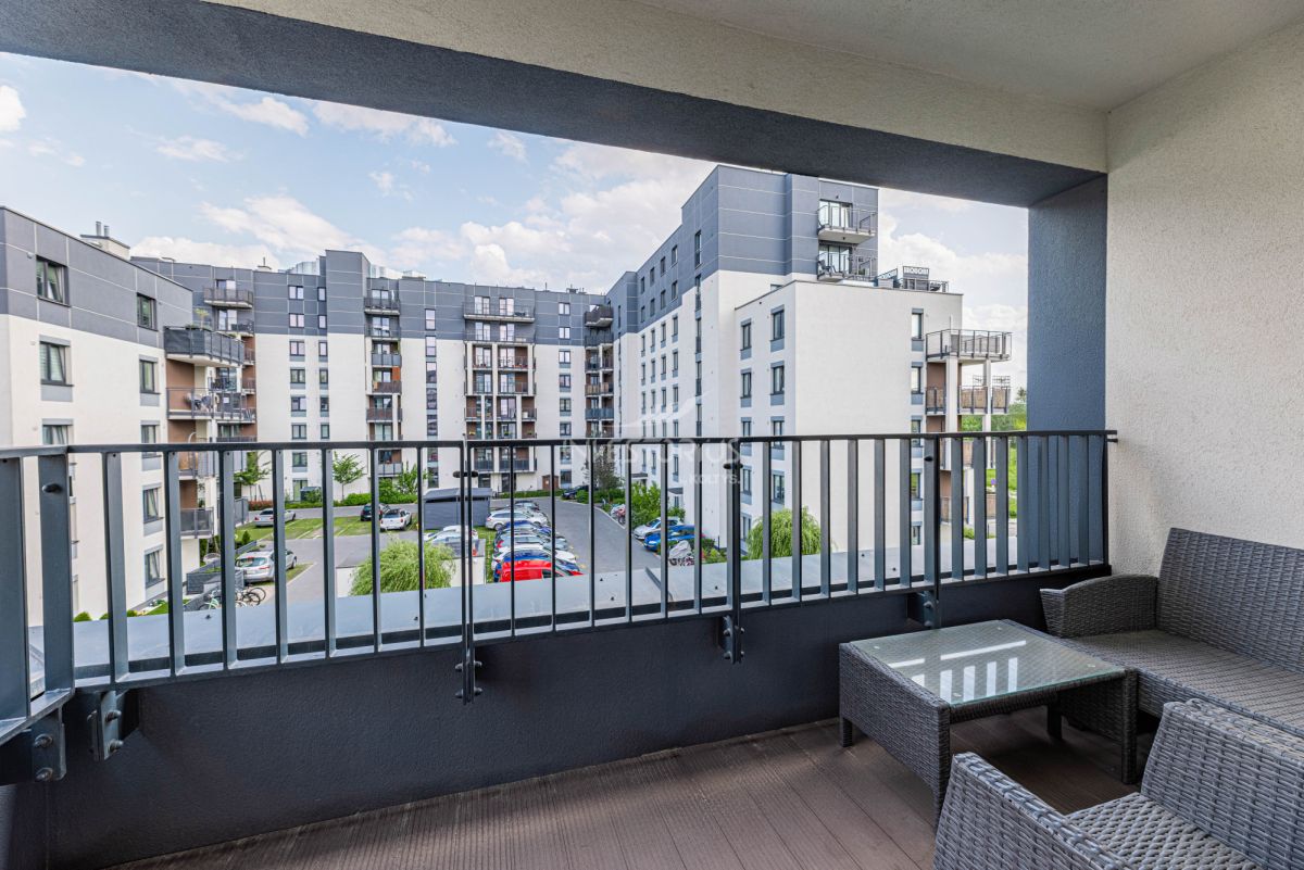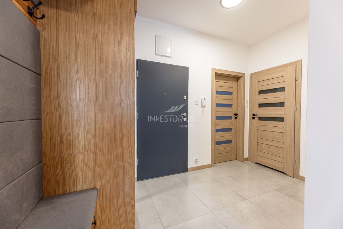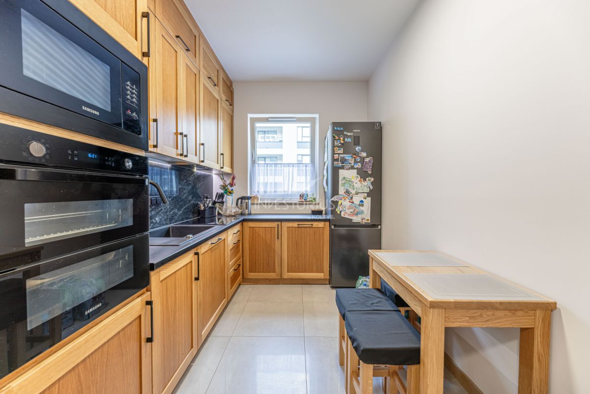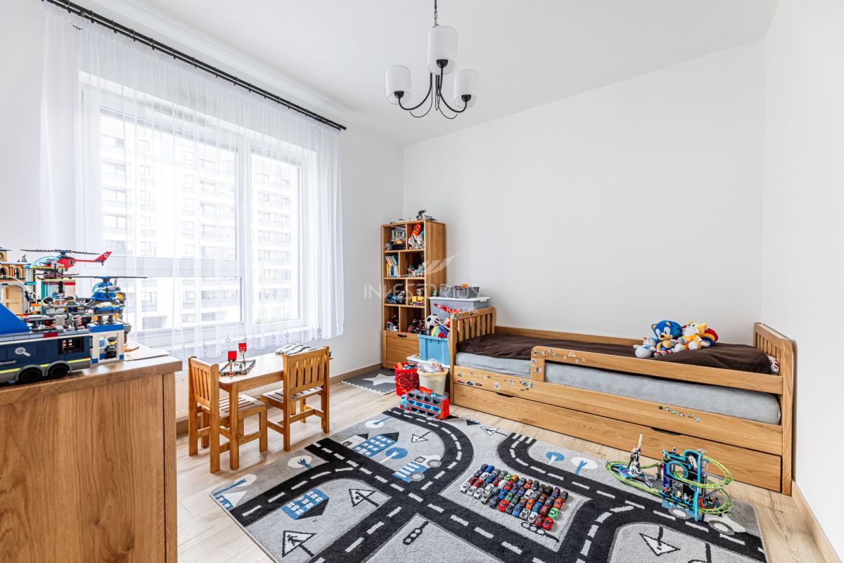 3-pokojowe mieszkanie z ergonomicznym i bardzo korzystnym układem: przestronny salon, osobna kuchnia (z możliwością otwarcia na salon), dwie sypialnie, łazienka, garderoba, przedpokój i duża loggia. Lokal wyposażony w wysokiej klasy meble wykonane na zamówienie. Dodatkowym atutem jest komórka lokatorska oraz miejsce w garażu podziemnym.