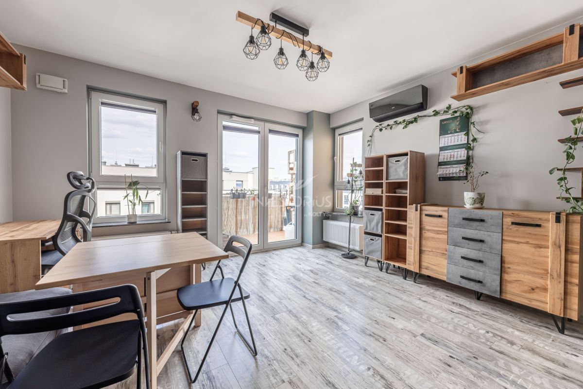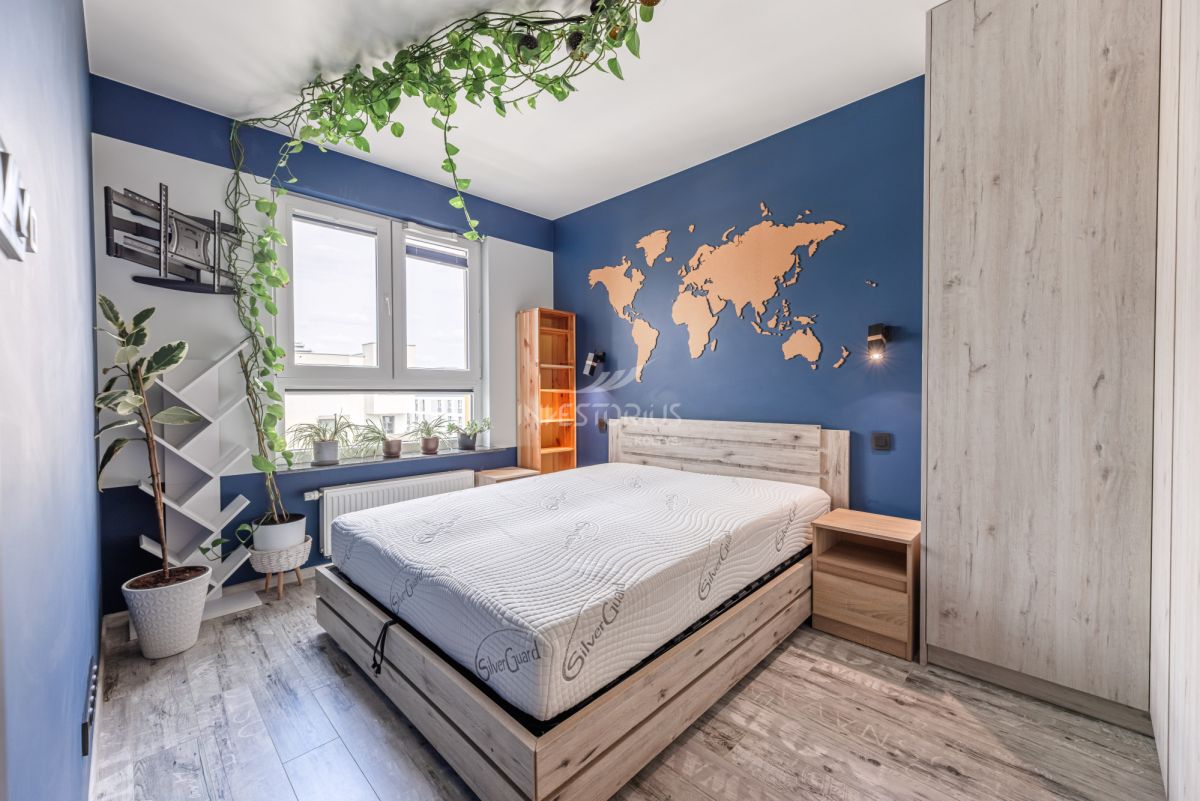 Ergonomiczny układ mieszkania to kolejny z jego atutów. Na powierzchnię składają się: przestronny salon (zamontowana klimatyzacja) z aneksem kuchennym i wyjściem na balkon, komfortowa sypialnia z dużą szafą, łazienka z kabiną prysznicową (meble wykonane na wymiar, z litego dębu) oraz przedpokój z pojemną zabudową. Wnętrze zostało zaaranżowane z dużą starannością. Całość tworzy przytulną i stylową przestrzeń do życia. Mieszkanie sprzedawane z kompletnym wyposażeniem.